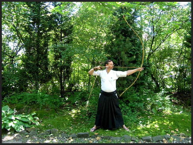 Schütze und Bogen, beide in voller Länge ... Der japanische Bogen („yumi“) misst etwa 220 Zentimeter.